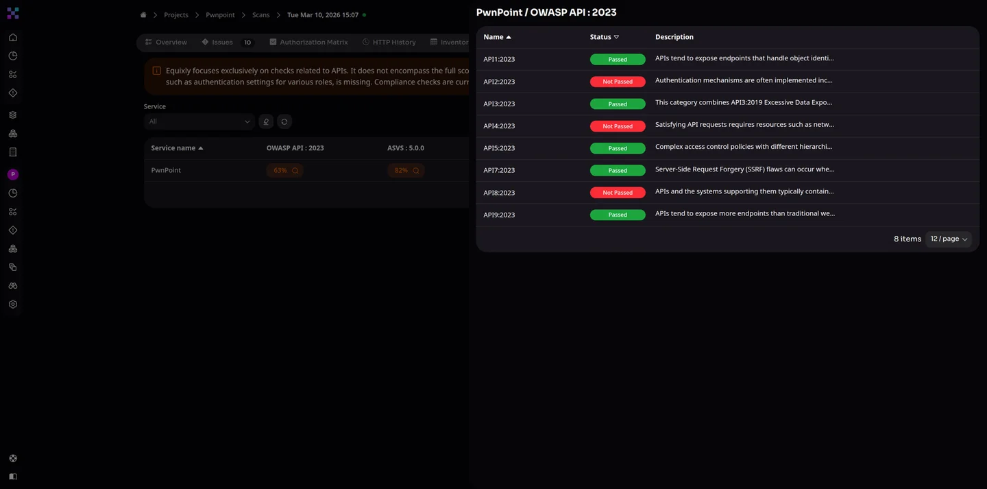 Equixly provides continuous, exploit-validated testing against the security frameworks and risk categories embedded in PCI DSS, DORA, ISO 27001, and NIS2. For PCI DSS, the platform continuously tests against the OWASP API Security Top 10 categories required for in-scope applications, providing the ongoing validation evidence that point-in-time assessments cannot sustain between annual compliance cycles. For DORA, Equixly's continuous offensive testing model directly satisfies the regulation's requirement for ongoing security validation rather than periodic snapshot assessments. For ISO 27001, the platform's continuous findings and remediation tracking provide the evidence of security control effectiveness that certification maintenance requires. Compliance reporting is available mapped to specific framework controls, enabling audit readiness without reliance on manual evidence collection.